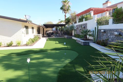 The work performed included designing and constructing a custom staircase with stone veneer to provide a cohesive look that complements the overall design. We added an inviting outdoor firepit area surrounded by stylish seating for social gatherings and relaxation. The installation of a pristine putting green added a touch of luxury and entertainment for the family and guests, while the meticulous landscaping incorporated lush greenery and stone elements to enhance the space's aesthetic appeal. Additional elements, such as the pergola and outdoor kitchen, were designed to maximize usability while maintaining a high-end, cohesive look.